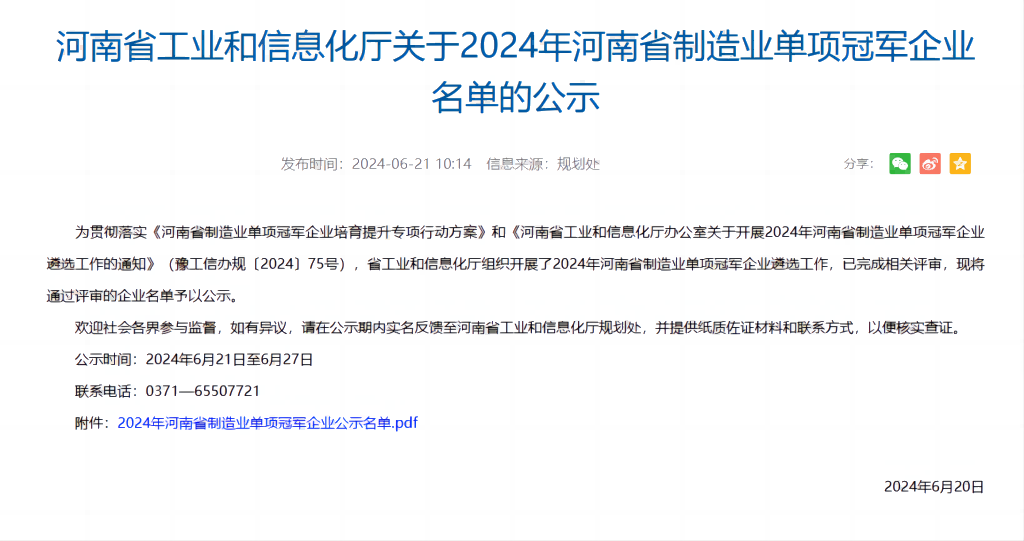 6月21日,河南省工业和信息化厅发布了《关于2024年河南省制造业单项冠军企业名单的公示》,3044永利集团荣登榜单。
