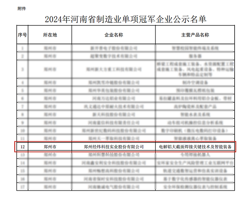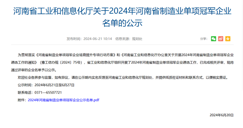 6月21日,河南省工业和信息化厅发布了《关于2024年河南省制造业单项冠军企业名单的公示》,3044永利集团荣登榜单。