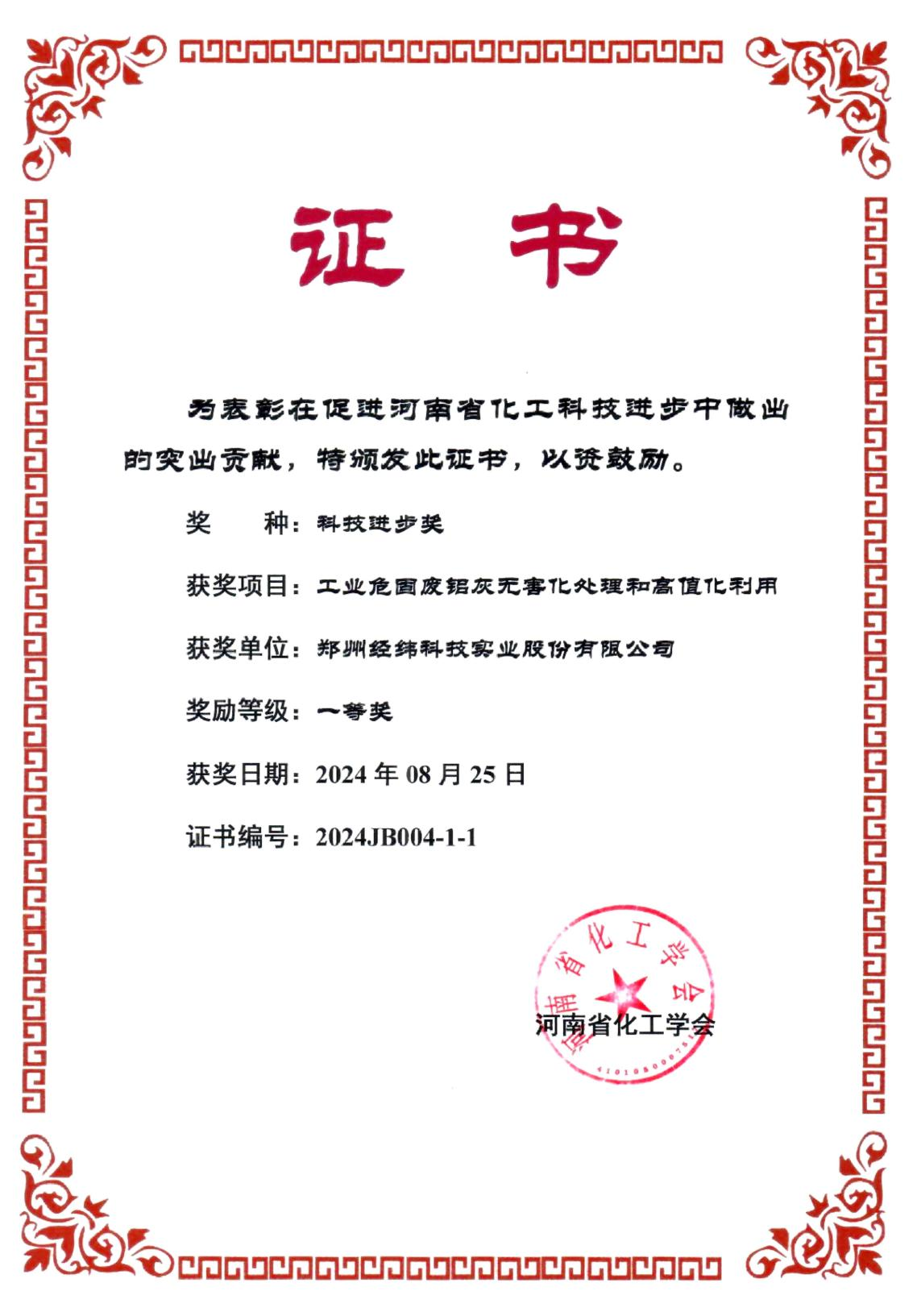 Recently, the review of Henan Chemical Industry Association Science and Technology Progress Award was completed, and the technical achievement of "harmless treatment and high-value utilization of industrial hazardous solid waste aluminum ash" completed by Zhengzhou Zhengzhou Jingwei Technology Industry Co., LTD. Industry Co., LTD. has won the first prize.